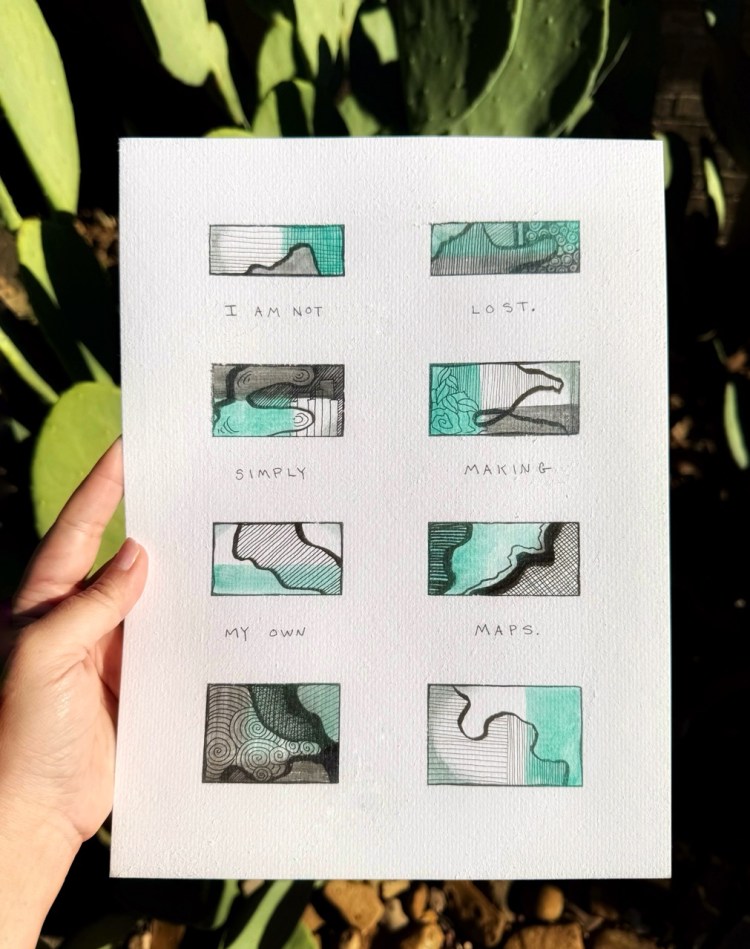 I went outside to take a picture of it and my neighbor walked by and said, “Oh that’s so pretty. ‘I AM NOT SIMPLY MY OWN. LOST. MAKING MAPS,’” and I was like, “Welp. Close enough, I guess.”