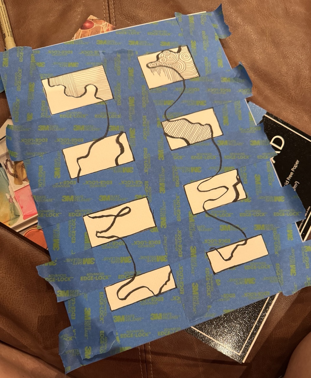 I put down painter’s tape on watercolor paper and then outlined the boxes and drew my own wild map borders.
