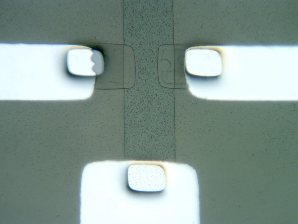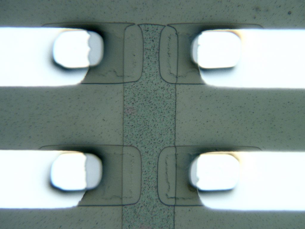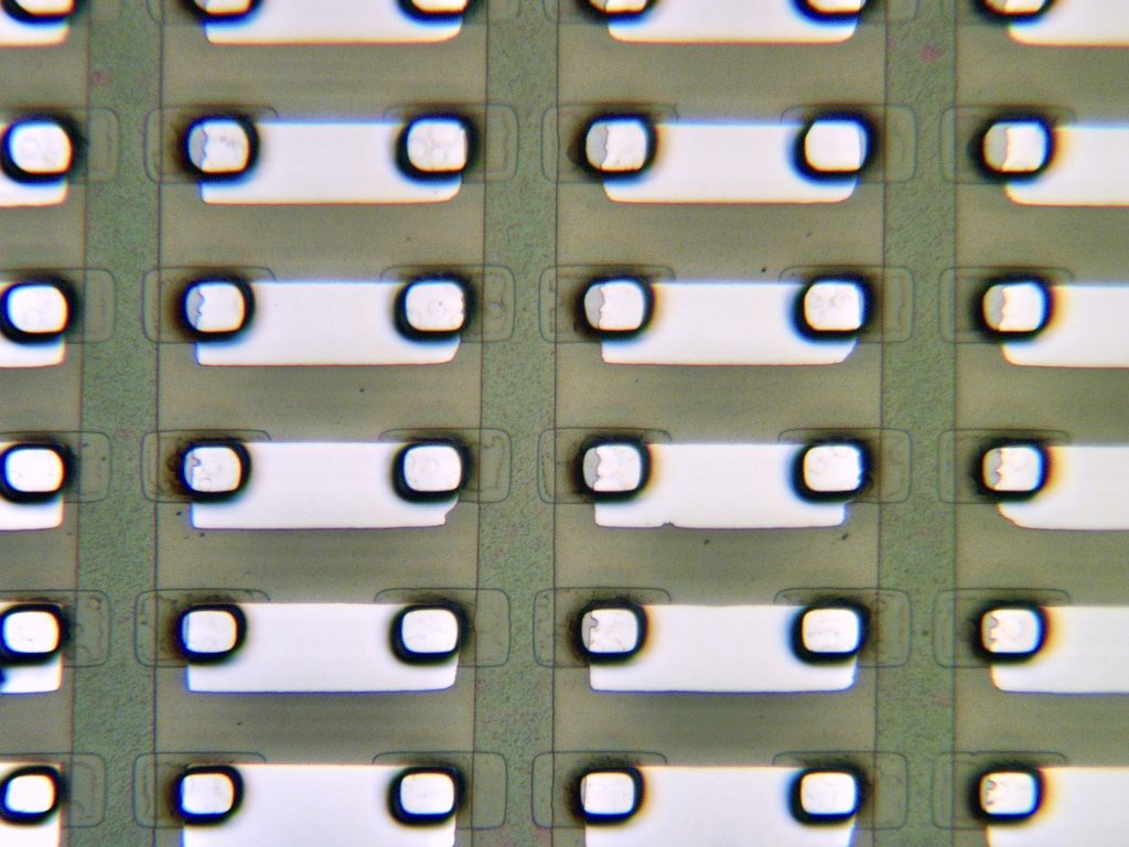 The chip is small, about one quarter the die area of my previous ICs (2.4mm^2) which makes it hard to probe. There’s a simple 10×10 array of N-channel FETs on each chip which will give me a lot of characterization data. Since it’s such a simple design, I was able to lay it out using Photoshop. Columns of 10 transistors share a common gate connection and each row is strung together in series with adjacent transistors sharing a source/drain terminal. It’s similar to NAND flash but I only did this to keep the metal pads large enough so I can reasonably probe them, if every FET had 3 pads for itself they would be too small.