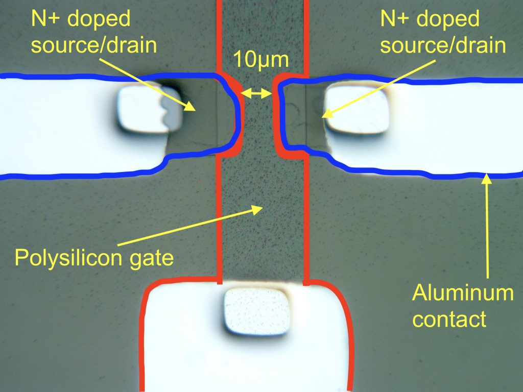 A single 10µm NMOS transistor can be see below, with slight misalignment in the metal layer (part of the left contact is uncovered). Red outline is polycrystalline silicon, blue is the source/drain.