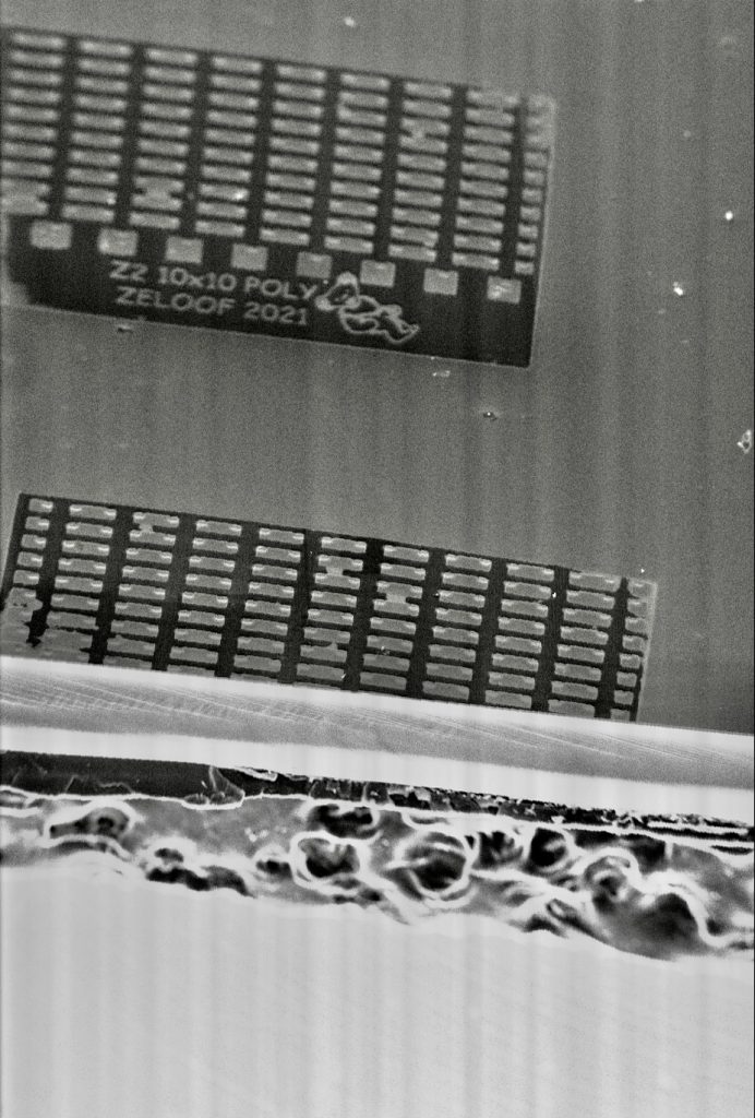 So far I’ve made an opamp (Z1) and a memory-like array (Z2). More interesting circuits are definitely possible even with this low transistor density. The process needs some tweaking but now that I’m able to consistently make good quality transistors I should be able to design more complex digital and analog circuits. Testing each chip is very tedious so I am trying to automate the process and I’ll post more data then. I’ve made 15 chips (1,500 transistors) and know there’s at least one completely functional chip and at least two “mostly functional”, meaning ~80% of the transistors work instead of 100%. No proper yield data yet. The most common defect is a drain or source shorted to the bulk silicon channel, not a leaky or shorted gate like on my Z1 process.