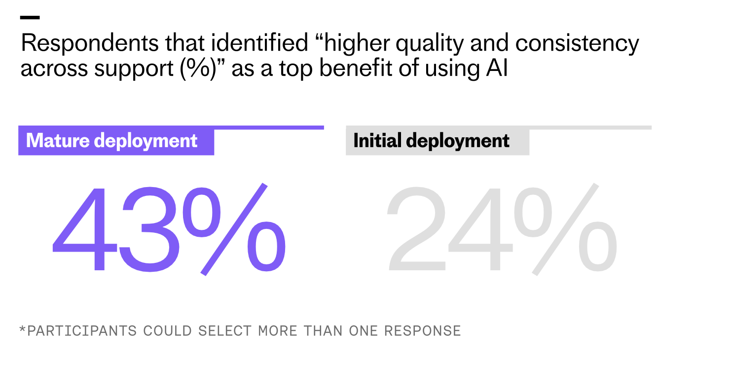 Reaching this level of maturity is where AI’s real value lies. We found that 43% of teams with mature deployment report higher quality and consistency across support – nearly double the rate of those still in the exploration or initial deployment stages.