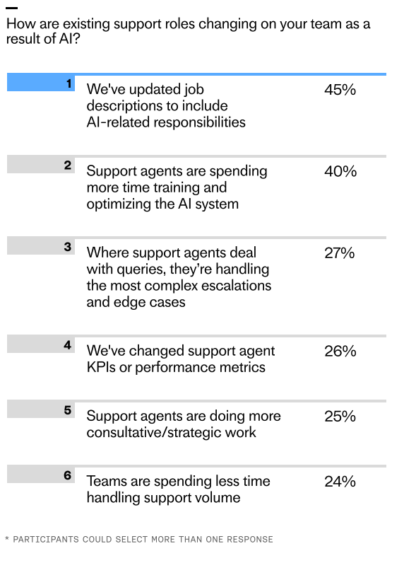 AI is reorganizing core customer service operations as it starts to take on a higher volume of work and more complex tasks. Even at the initial deployment stage, 16% of teams report spending less time handling support volume since implementing AI – and among teams who’ve reached maturity, that figure rises to 28%.