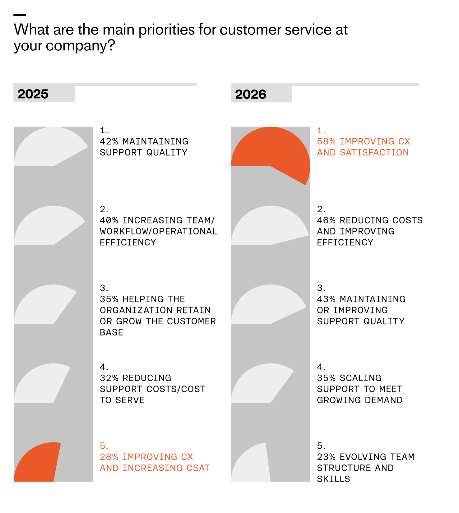 More than ever, teams are focused on improving customer experience and satisfaction, with 58% saying it’s the top priority for 2026. That number has more than doubled since last year, when just over a quarter (28%) of respondents cited it as a top priority.