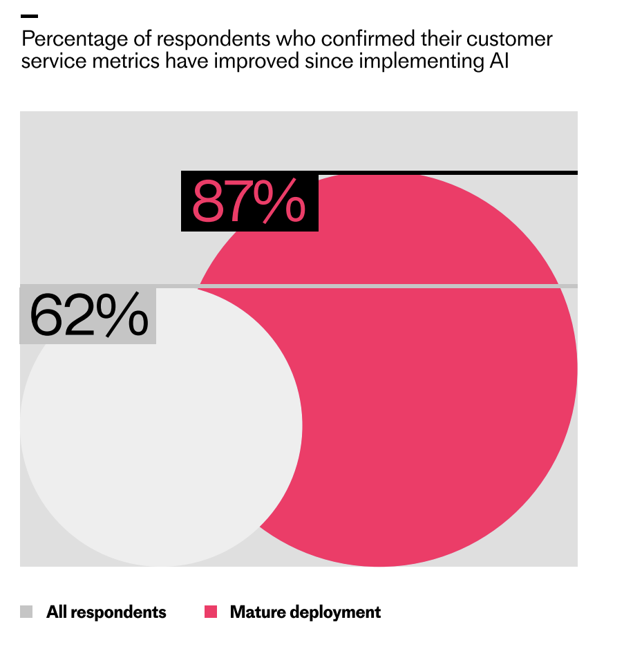 The economic benefits of AI tend to show up first in speed and throughput, and they show up fast. Across all respondents, 62% say their customer service metrics have improved since implementing AI.