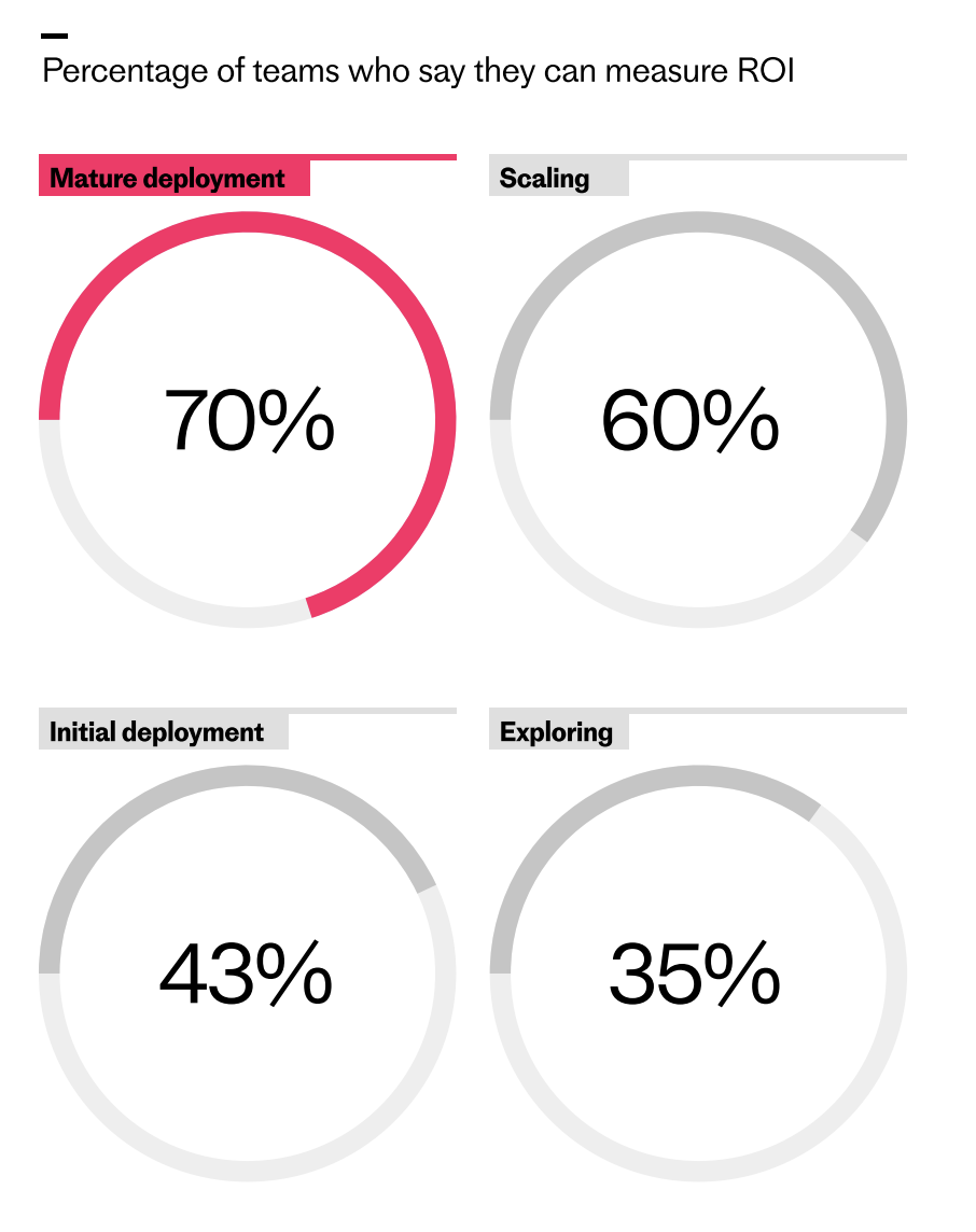 What’s more, teams with more mature deployments are significantly more likely to say they can measure the return on their AI investment.