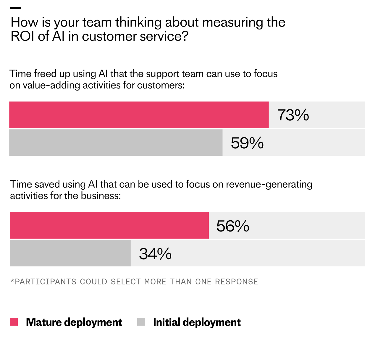 The report data shows this clearly. Across all maturity stages, the most commonly cited measure of ROI is “time freed up that the support team can use to focus on value-adding activities for customers.” But at mature deployment, that signal intensifies, with 73% of teams citing it, compared to 56% at early exploration.